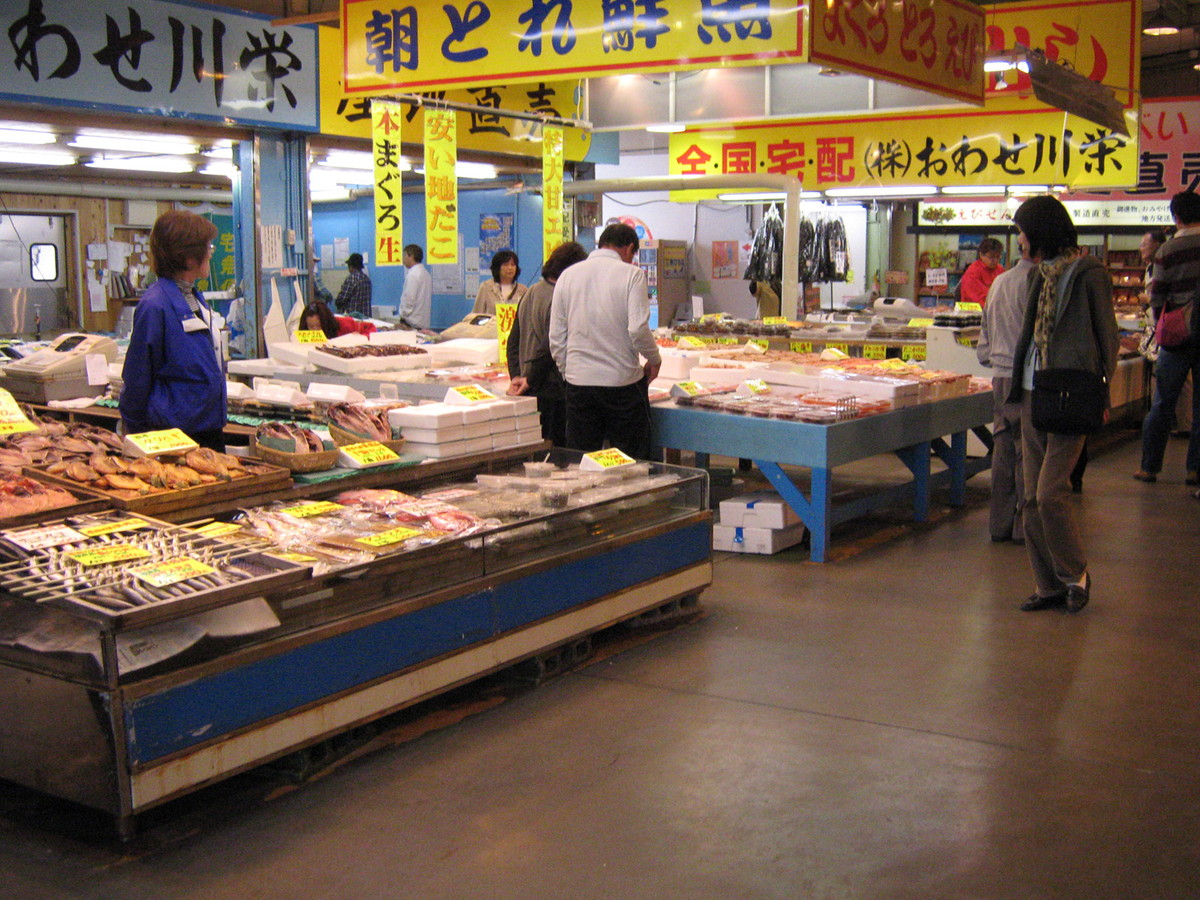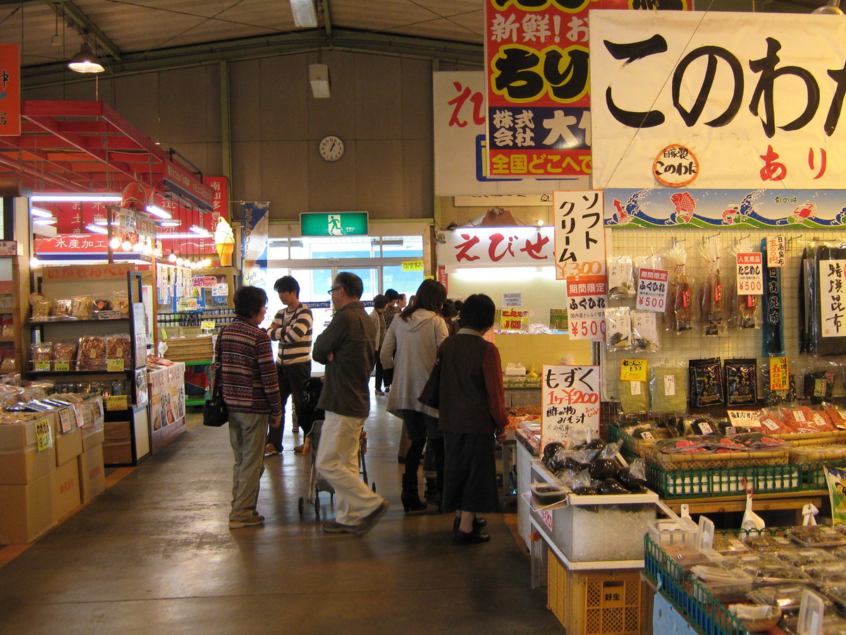水揚げされたばかりの新鮮な魚介類が並び、どのお店の店員さんも威勢が良く、活気ある市場の様子を楽しみながら買い物できます。その場で三枚におろしてもらったり、どんな食べ方が美味しいかなども聞けるのは嬉しいですね。干物を扱うお店もあり、宅配便利用もできるのでたくさん買った時はお願いしてしまいましょう。