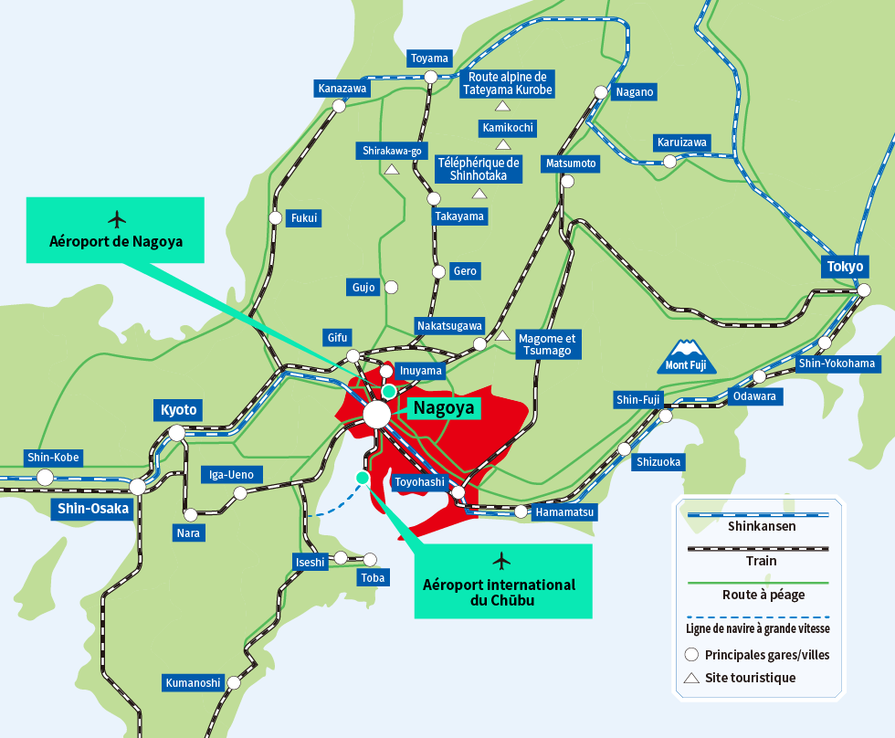 Tokyo, Nagoya et Osaka sont reliés par la ligne Shinkansen Tōkaidō, ce qui facilite l'accès aux grandes villes depuis la préfecture d'Aichi.
