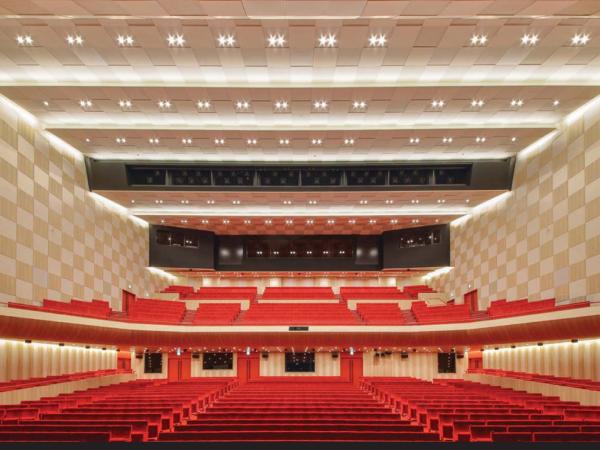 Par exemple, l'impressionnante façade en treillis exprime la conception des « murs de namako » (un mur que l'on trouve couramment dans les entrepôts traditionnels japonais), qui était aussi le motif de la facade du théâtre précédent, d'une manière propre à Kuma. Un éclairage spécial a été utilisé pour l’envelopper de lumière et donner une impression de splendeur.