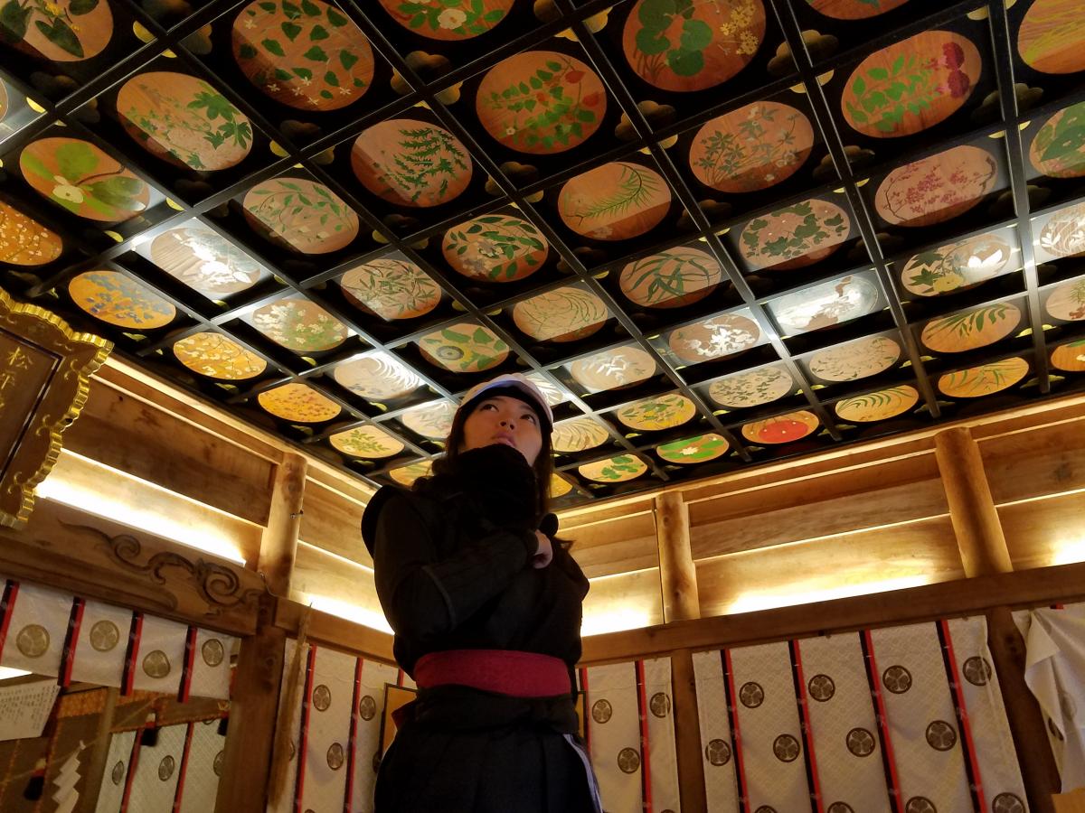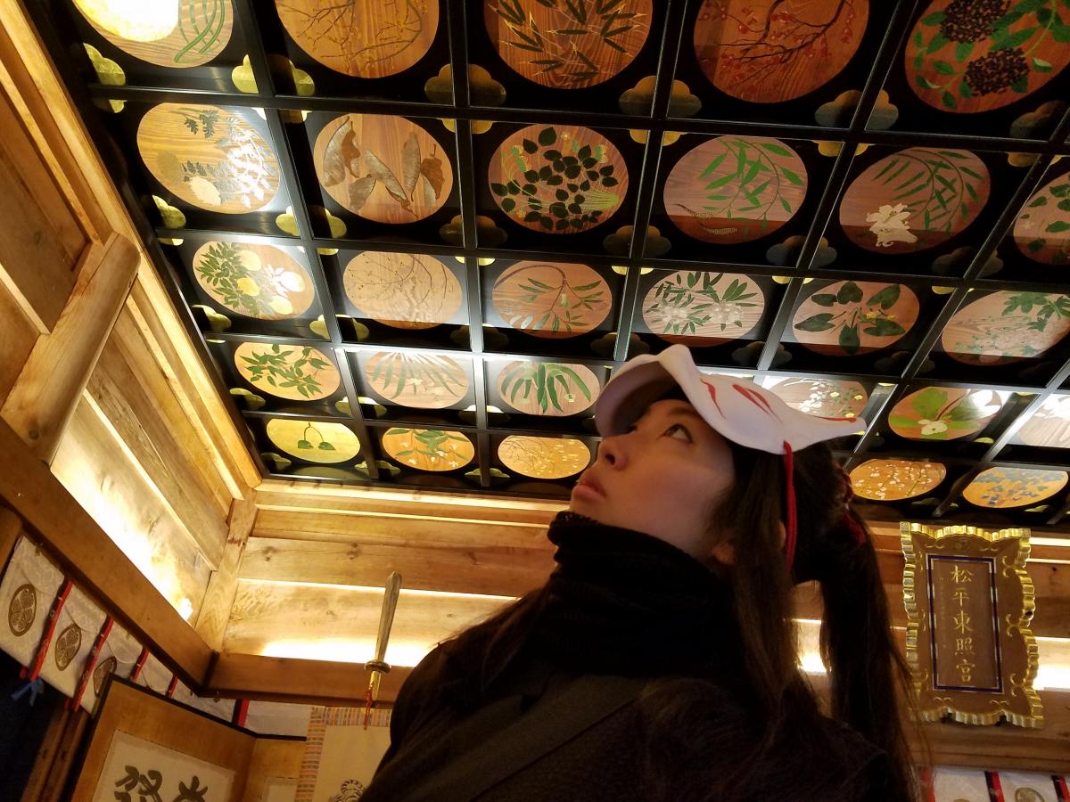 「上を見ずにはいられない迫力じゃ!天井の四隅には東照宮ゆかりの“双葉葵”もあるぞ。実にあっぱれじゃな」