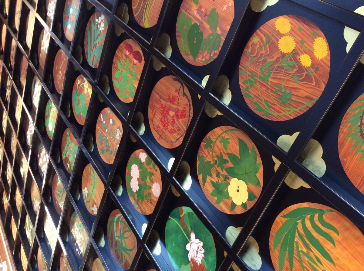 上を見ると天井画がいちめんに。これは徳川家康公400年祭記念大会のメモリアル事業で実現したもので、豊田市在住の漆芸家 安藤則義氏の手により、豊田の四季折々の草花が105種類描かれています。