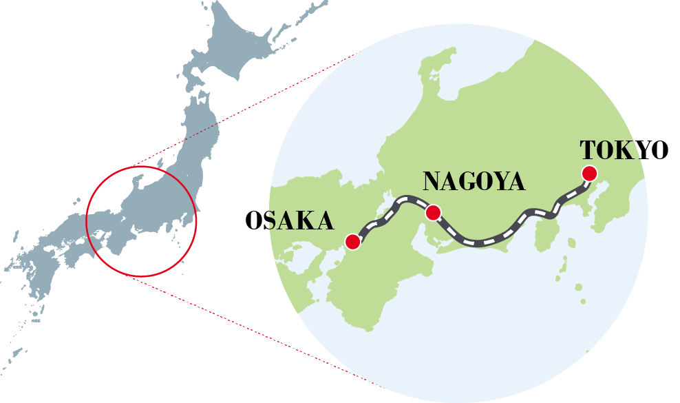 Tokyo, Nagoya, dan Osaka dihubungkan oleh Tokaido Shinkansen sehingga mudah untuk mengakses kota-kota besar dari Aichi.
