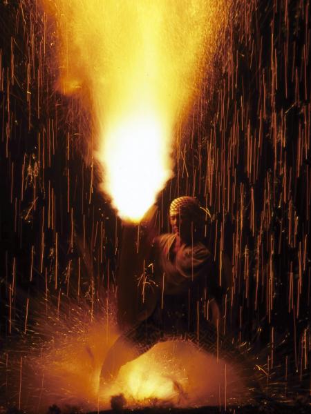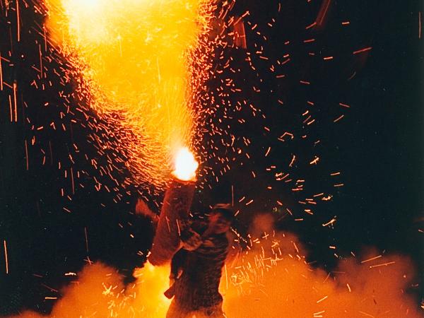 Pertama, peluncur kembang api memegang silinder yang sudah dinyalakan di bawah lengannya. Kemudian, pilar api besar secara bertahap menyembur dari silinder, dan sejumlah besar bunga api jatuh menghujani seluruh tubuh. Para laki-laki yang memegang silinder tidak akan bergerak sedikit pun tidak peduli apa yang terjadi. Ketika nyala api yang disebut “hane” berhembus di kaki dengan suara keras, itu adalah tanda berakhirnya kembang api. Ketika penonton yang antusias memberikan mereka tepuk tangan yang meriah, para laki-laki itu akhirnya menunjukkan ekspresi lega.