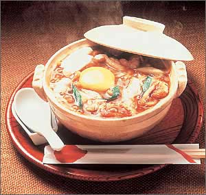 Freshly cooked noodles kneaded with fresh water without any salt and cooked in the red miso base soup with substances of ginger, green onions, kamaboko and chicken in an earthen pot. It holds a solid position as a taste of Nagoya.