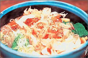 It is a flat and wide noodle and is famous for its fine, palatable and smooth taste served in a soup of weaker soy sauce with deep-fried bean curd, green nappa and shavings of dried bonito.