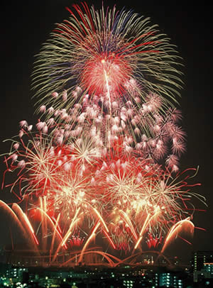 Some 12,000 colorful fireworks such as the 550m-long Niagara Falls, starmines and melody fireworks are skyrocketed on the banks of the Yahagi River.
