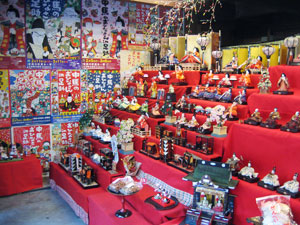 Hina-dolls are displayed under the eaves of over 100 shops and houses in Asuke.