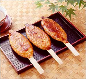 Homemade miso with chopped green onions is served on non-glutinous rice grown by farmers in Asuke and then it is carefully baked over charcoal.