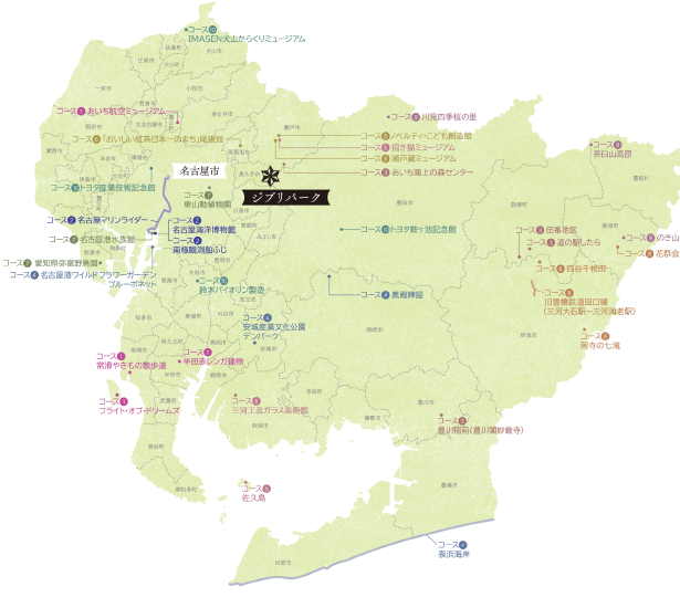 1.ジブリパーク→名古屋市内泊→2.あいち航空ミュージアム→3.半田赤レンガ建物→南知多温泉郷泊→4.フライト・オブ・ドリームズ→5. 常滑やきもの散歩道