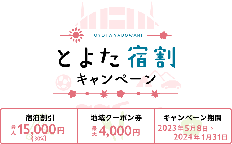 豊田市内の登録されたホテル・旅館を利用した場合や、旅行会社等のとよた宿割適用プランをご利用いただいた場合に、宿泊・プラン代金の30%の割引を行い、更に宿泊プランについては地域クーポン券を配布します。