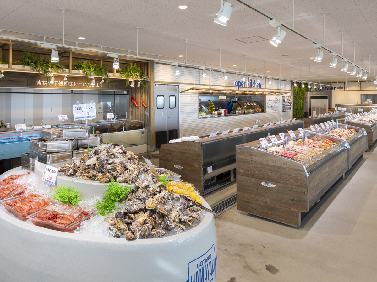観光のお土産目的で立ち寄る方も大喜び間違いなし!隣の海鮮市場では新鮮な海産物が揃い、何を買おうか迷ってしまうほど。中でも人気商品は魚太郎で作られている干物。ぷりぷりに身のつまった干物は、お魚好きにはたまりません。生簀の中には、活のいい魚がたくさん。勿論、その中から選んで買うことができ下ろしてもらえます。