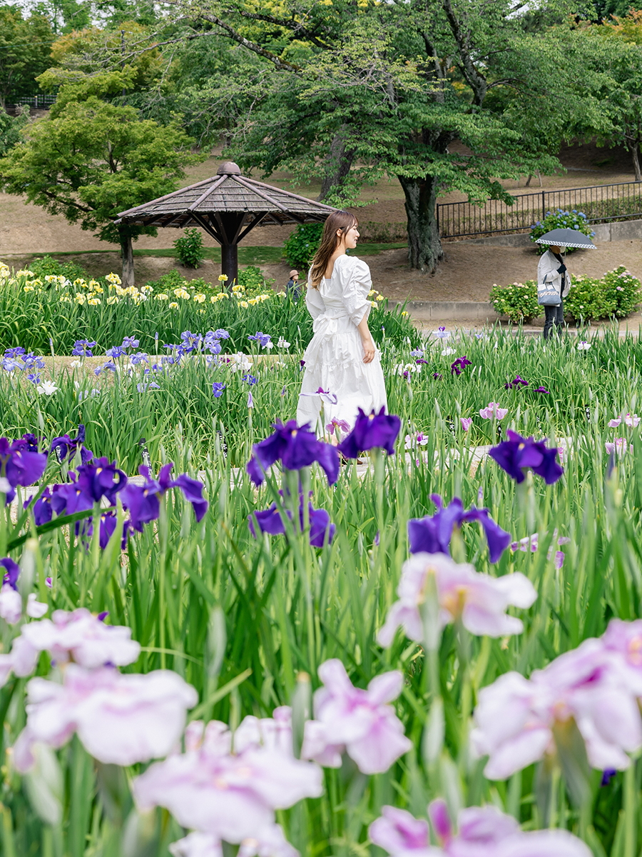 広さ約2900㎡の敷地に約120種・1万株の菖蒲が育てられています。毎年市外からも多くの人が訪れ、初夏の風情を味わえます。