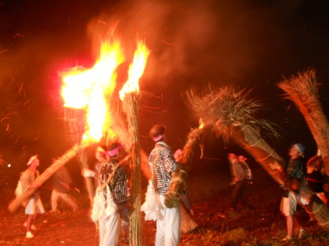 毎年8月15日のお盆の夜、長篠・設楽原決戦場跡にある信玄塚において火おんどりが行われます。