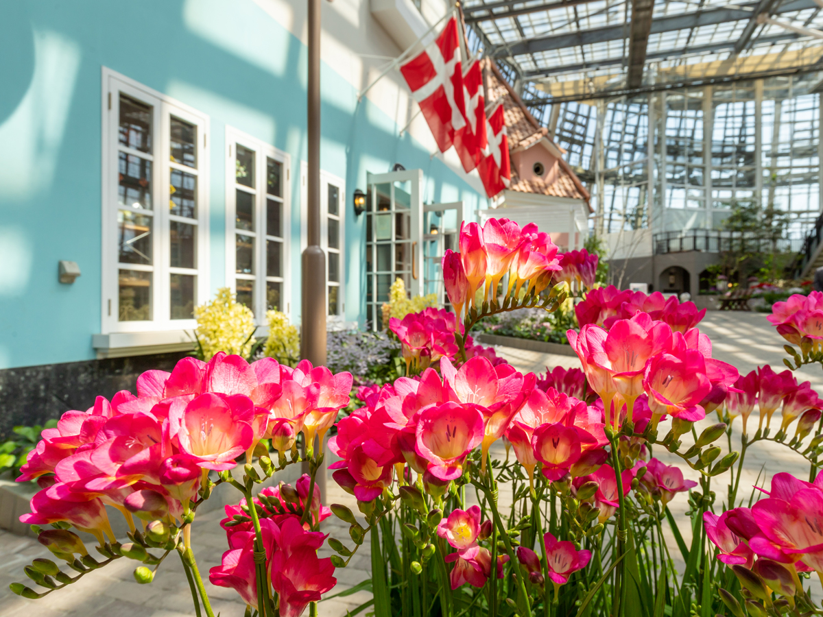 高さ19mあるシンボルのデンマーク風車がある広場は、全長55mのローラー滑り台などお子さまに嬉しい遊びのエリアとなっています。花の大温室フローラルプレイスにはデンマークの街並みが再現され、季節ごとのフラワーショーや、デンマークの北欧テイスト溢れる雑貨を巡るショッピングも楽しみのひとつです。