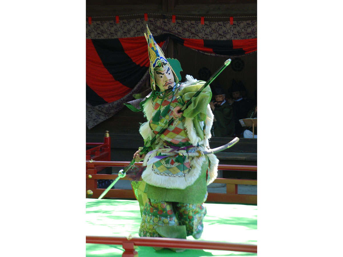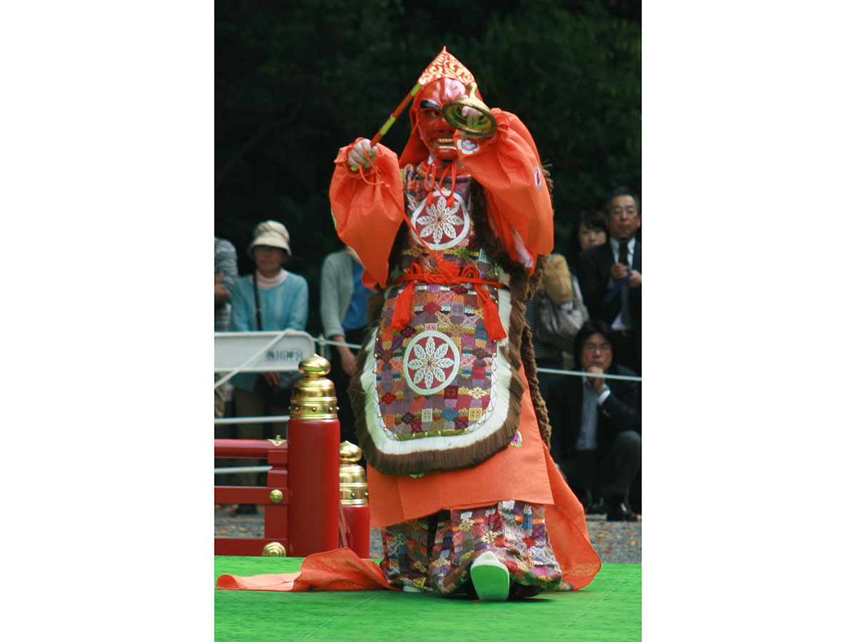 神職・巫子並びに桐竹会(熱田神宮の雅楽奉仕団体)会員により、平安の昔のままに神前に奉納されます。熱田神宮宝物館に収蔵するあまたの舞楽面は、平安から鎌倉期の製作と推定される貴重な文化財です。