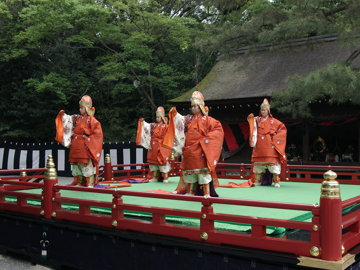 平安時代より伝わる神事です。神楽殿前庭に朱塗の高舞台を設け終日舞楽を奉奏(ほうそう)します。その舞振りは神苑の新緑に映えて美しく、拝観者を王朝絵巻の世界へ誘います。