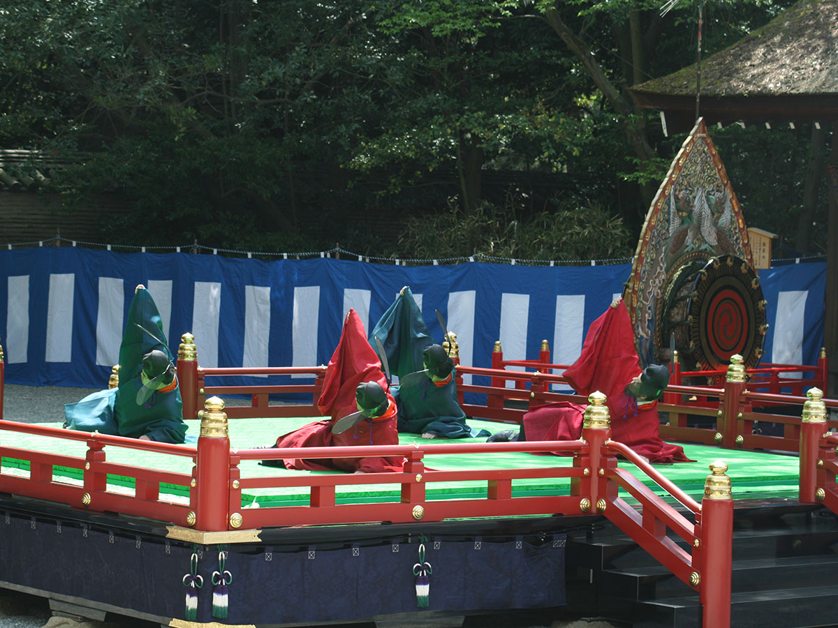 新緑にあざやかに映える朱塗りの高舞台。響き渡る舞楽の音色にあわせ、祓いの意味が込められた振鉾(えんぶ)から長慶子(ちょうげいし)まで次々に奉奏します。