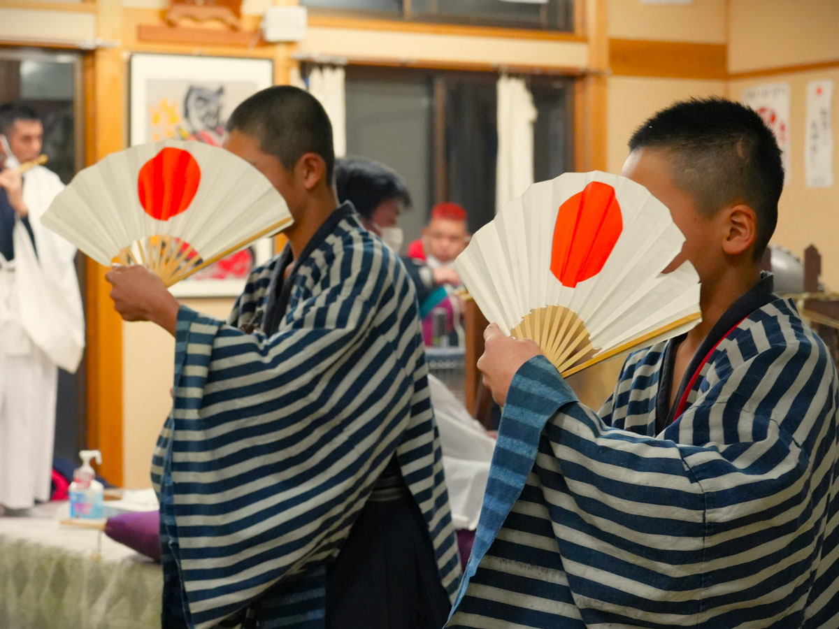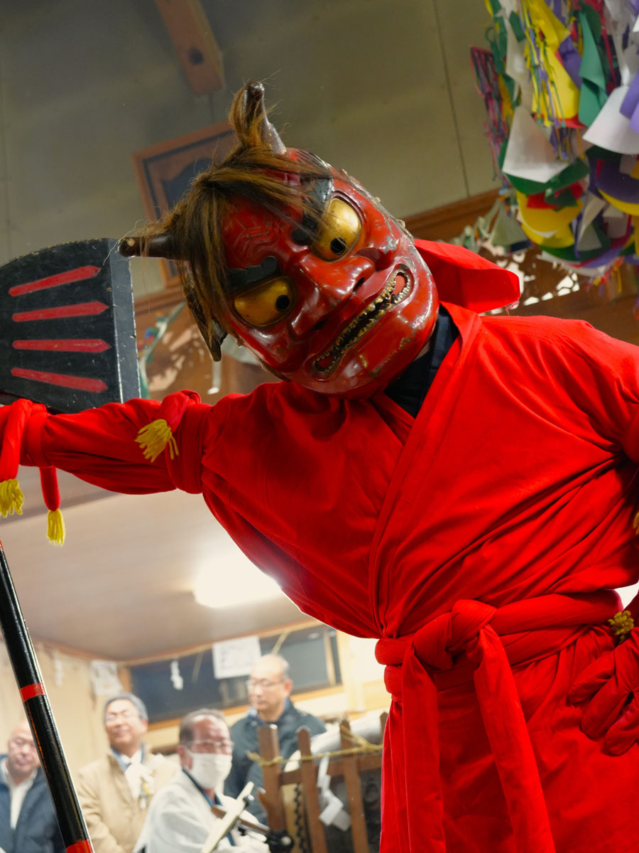 花祭は700年以上続く伝統神事芸能で、国の重要無形民俗文化財に指定されています。祭りでは「花宿」と呼ばれる建物を五色の紙で作った「切り草」で飾り、その土間を「舞庭」として、八百万の神に舞を奉納します。子どもたちが愛らしく舞う「花の舞」、巨大な仮面の鬼が鉞をかざして舞う「山見鬼」「榊鬼」など、さまざまな舞が夜を徹して舞われます。