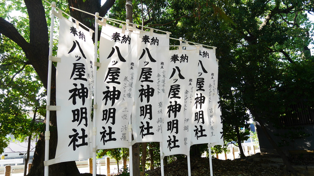 八ツ屋神明社は、滑り台や鉄棒もある昔ながらの小さな神社。オリンピックの有名選手の名前の入った奉納幟や絵馬がいくつも掲げられています。勝負の神様として有名で、受験、就活、試合前に多くの方が参拝されるとか。