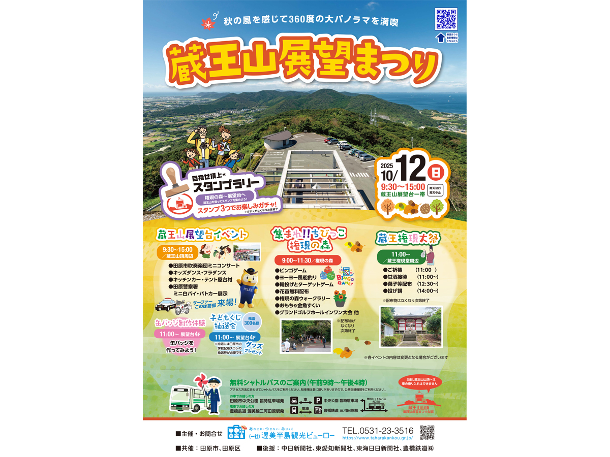 田原市の中心にそびえる蔵王山の山頂や山麓一帯で「蔵王山展望台イベント」、「集まれ!ちびっこ権現の森」、「蔵王権現大祭」などが開催されます!食べて、見て、遊んで、秋の渥美半島・蔵王山を満喫しよう♪