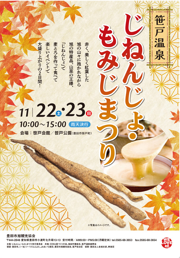 旭じねんじょフェスタが平成16年から開催される様になり、平成20年からもみじまつりと一緒になりました。笹戸公園の紅葉を目で味わい、旭地区特産の自然薯を舌で味わい、和太鼓演奏やステージイベントを耳で味わい、体全体で笹戸の秋を満喫してみませんか。
