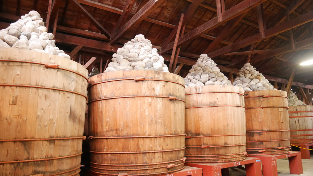 カクキューの「八丁味噌」は、大豆と塩のみを原料に大きな木桶の中に仕込み、その上に職人の手で天然の川石をピラミッド状に積んでいき、その状態で二夏二冬(2年以上)じっくり熟成させて作られます。