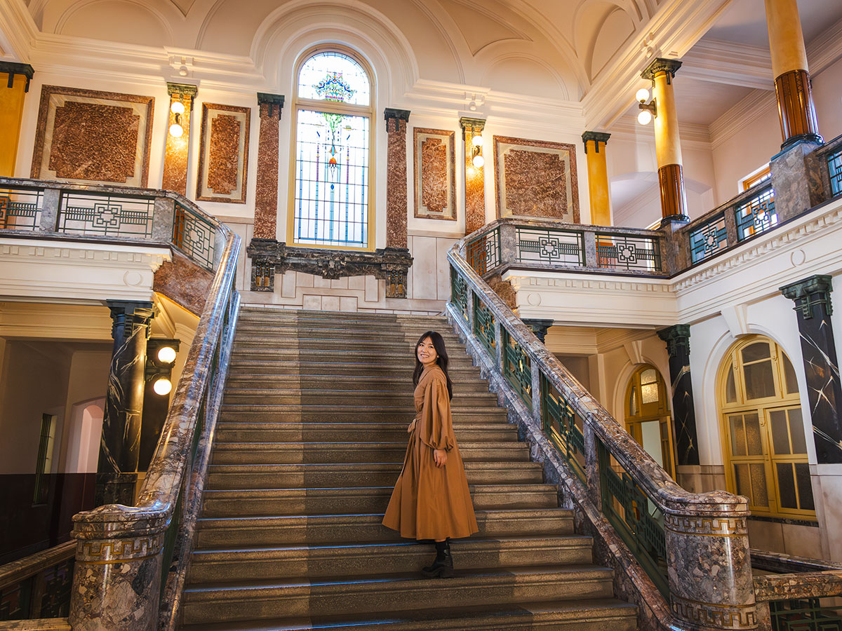 中央階段室のステンドグラスは、建築時のものを復原整備。ほか、漆喰塗りやマーブル塗りなど高度な技術をほどこした内装を見学できます。荘厳な雰囲気を、ぜひ一度味わってみてください。