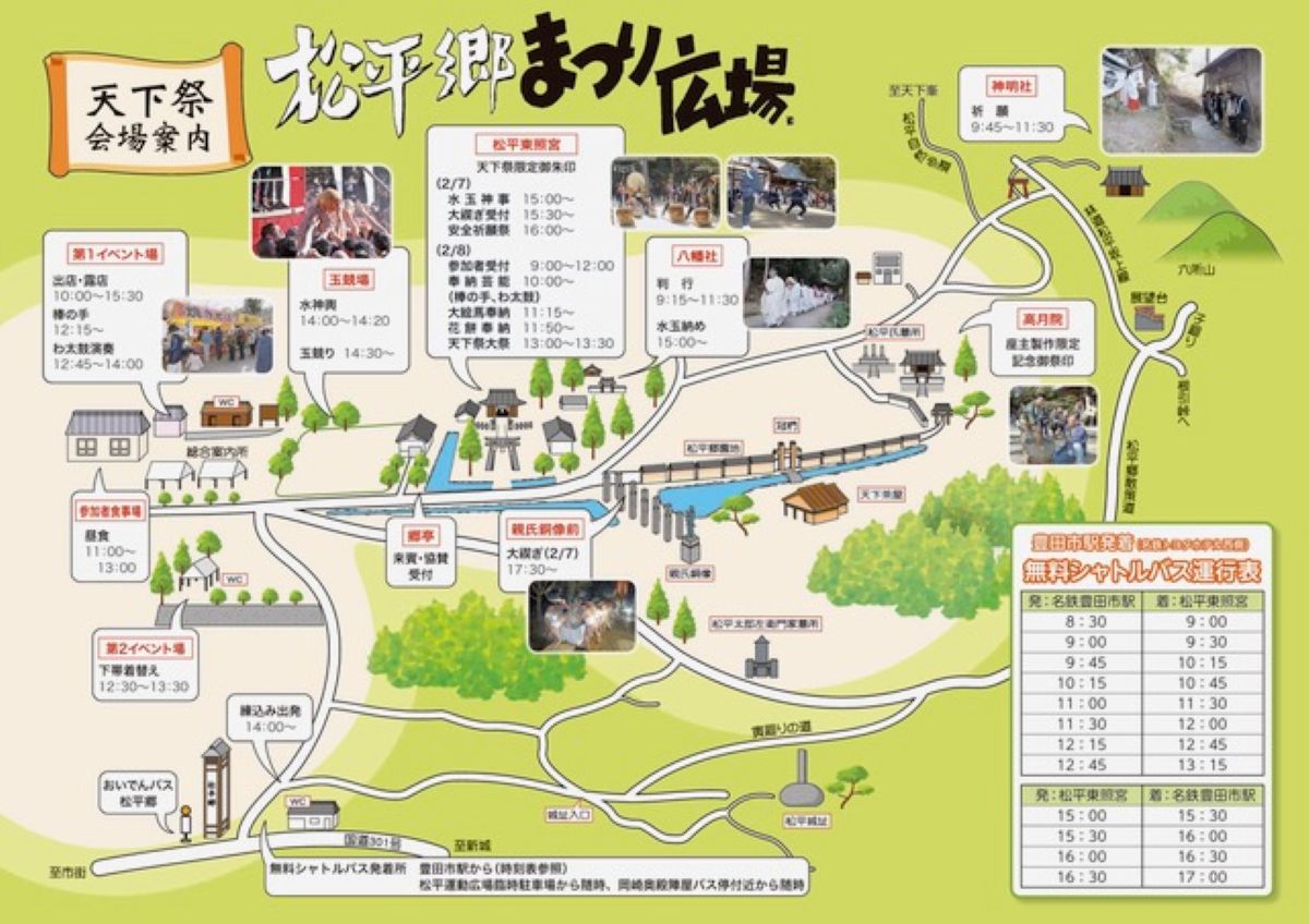 ◎名鉄三河線「豊田市」駅よりとよたおいでんバスに乗り換え、「松平郷」停留所下車