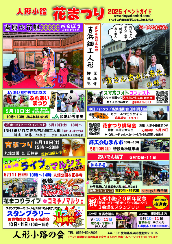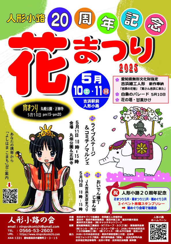 白象のパレードや花まつりマルシェ、スタンプラリーなど、各種イベントが開催されます。また3番館と宝満寺では、愛知県無形文化財「吉浜細工人形」新作奉納展覧が行われます。