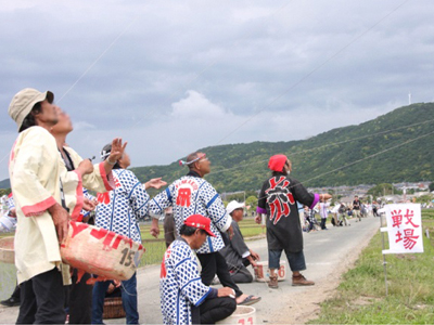凧糸に南京(ナンキン)と呼ばれるガラスの粉を付けて、相手の凧糸に絡めて凧糸を切り合います。真上から突然襲い掛かる「急降下」や、猛スピードで左右に移動する「つばめ返し」など様々な技が繰り広げられ、「うなり」と呼ばれる激しい音を響かせながら空中戦が繰り広げられます。