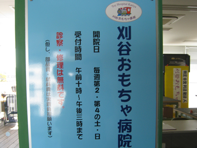管理棟の2階では毎月第2・第4の土曜日・日曜日におもちゃ病院が開院されています。細かい注意事項がありますので、詳しくはこちら>>をご確認の上ご利用ください。