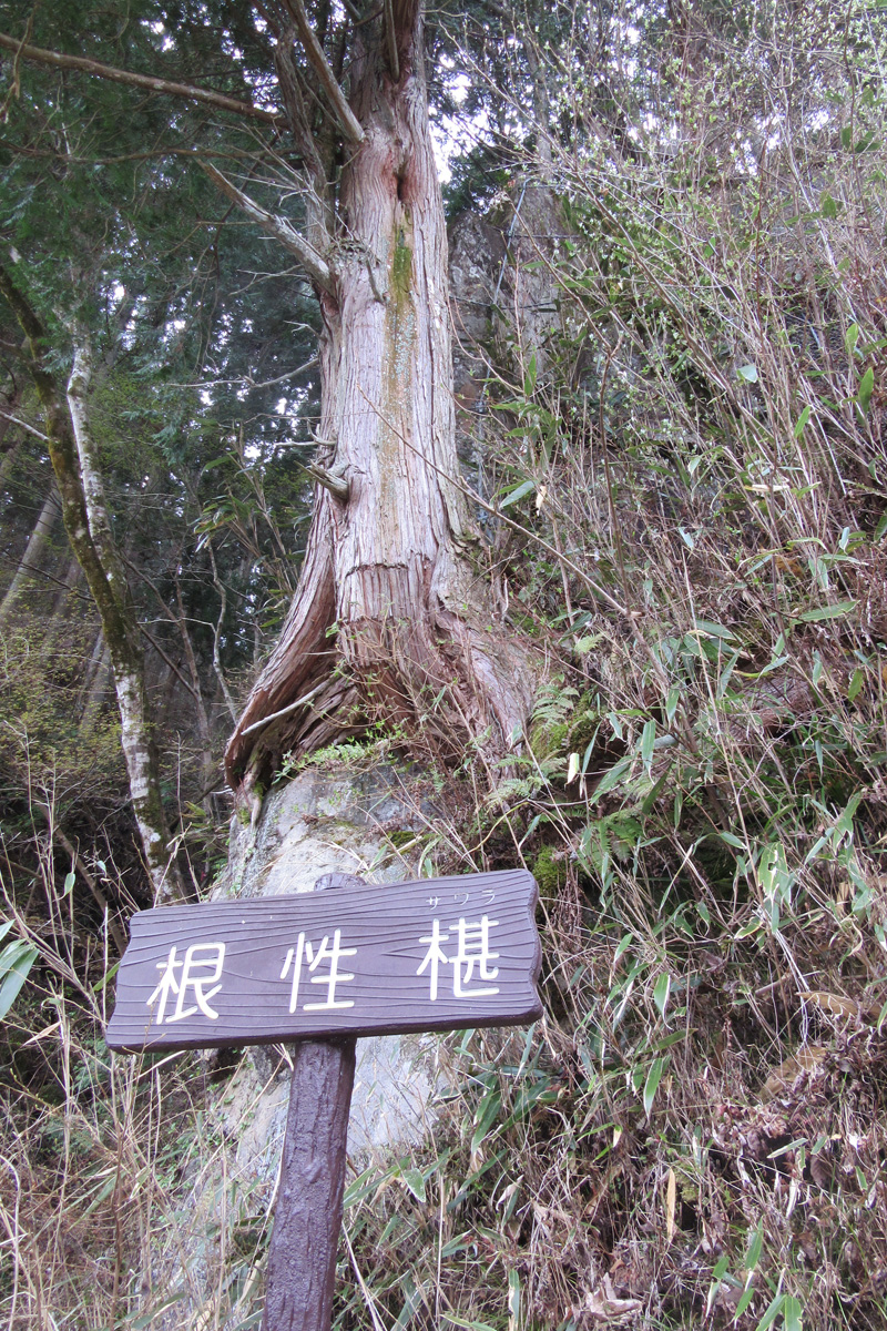 岩にしがみついたように見えるサワラの木。