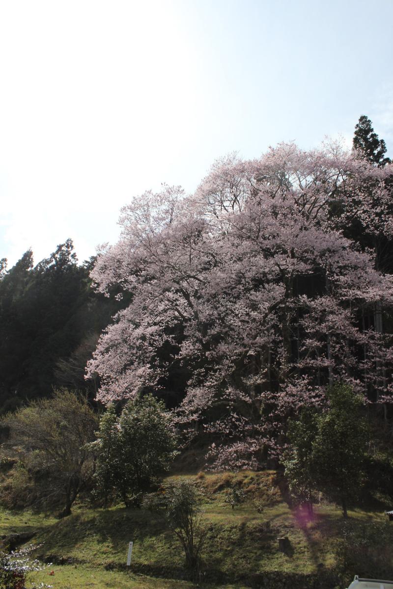 国道473号沿い「愛知東農協神田こんにゃく村」を過ぎ、400m程進むと橋があります。その橋を渡り、すぐ右折し、100m程進んだ民家の裏山に圧倒的な存在感ある大きなエドヒガンザクラがそびえます。高さは25m、根回りは3m以上はあり、樹齢は推定80年。国道沿いに目を移すと、樹齢150年ほどの親桜があります。この2本桜は「兄弟桜」とも「親子桜」とも言われます。その昔、同じ所(川沿い)にあった桜を一本分け植えたものだと言われてており、近年では地域の方が周囲を伐採するなどし、整備され、地域のシンボルとして大切に育てられています。