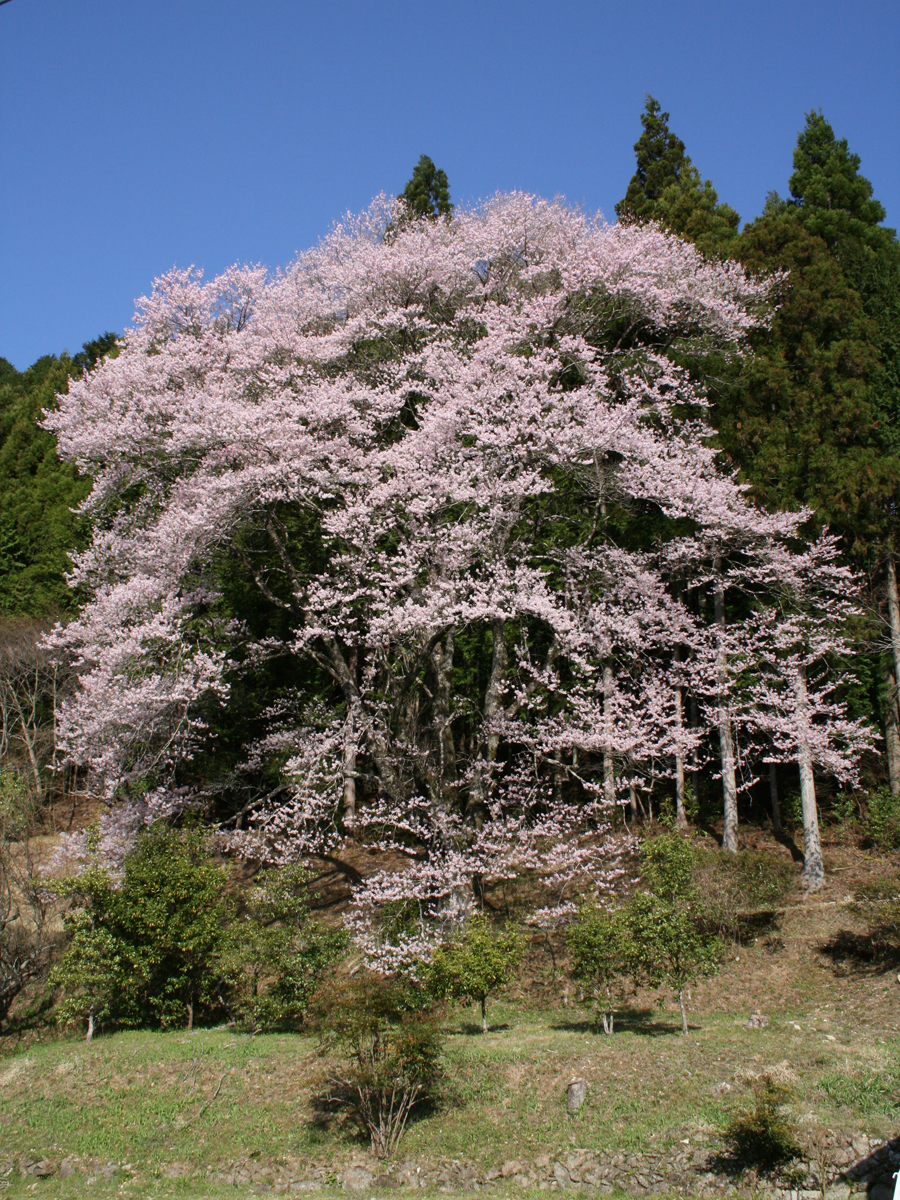 国道473号沿い「きのこの森」を過ぎ、400m程進むと橋があります。その橋を渡り、すぐ右折し、100m程進んだ民家の裏山に圧倒的な存在感ある大きなエドヒガンザクラがそびえます。高さは25m、根回りは3m以上はあり、樹齢は推定80年。国道沿いに目を移すと、樹齢150年ほどの親桜があります。この2本桜は「兄弟桜」とも「親子桜」とも言われます。その昔、同じ所(川沿い)にあった桜を一本分け植えたものだと言われてており、近年では地域の方が周囲を伐採するなどし、整備され、地域のシンボルとして大切に育てられています。