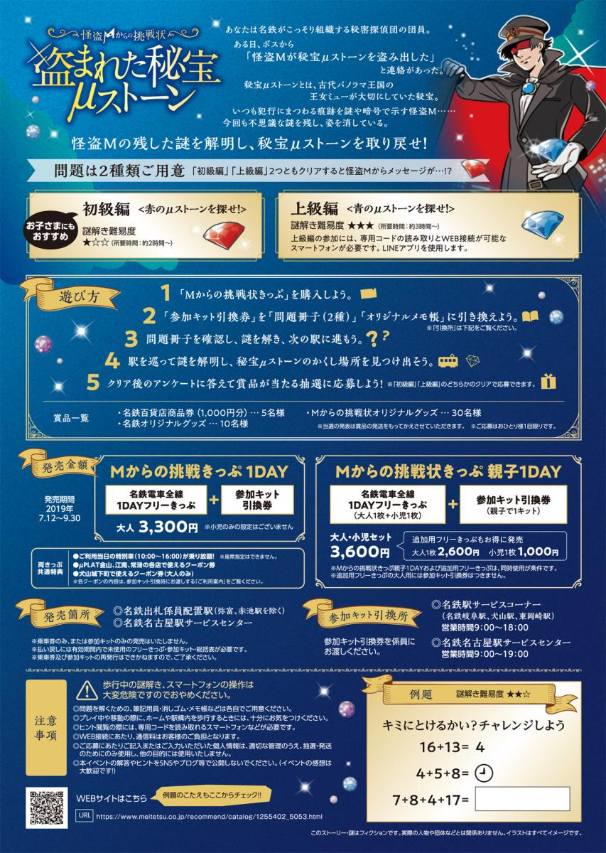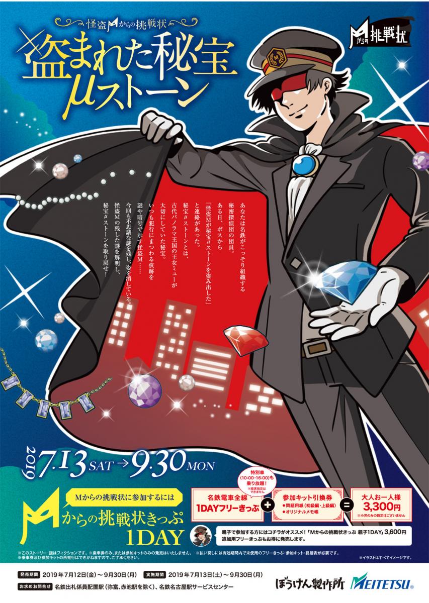 あなたは、名鉄がこっそり組織する秘密探偵団の団員。ある日、ボスから『怪盗Mが秘宝μストーンを盗み出した』と連絡があった。