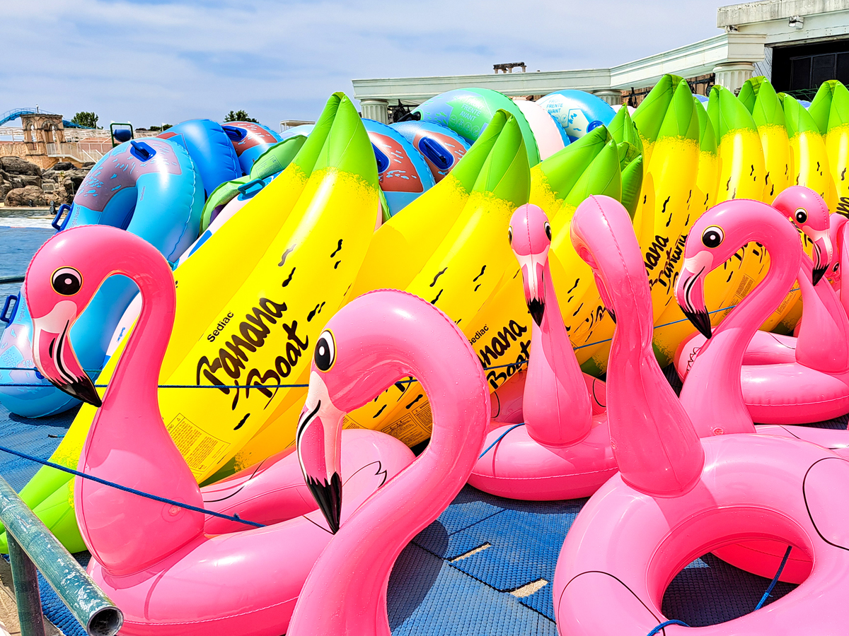 ラグナシアでは種類豊富な浮き輪のレンタルを行っています。「浮き輪フリーパス」を利用すれば、行き帰りに浮き輪を持ち運ぶ手間や準備・片付けがなくなります。ナイトプールでは SNS 映えする光る浮き輪などもご用意しております。