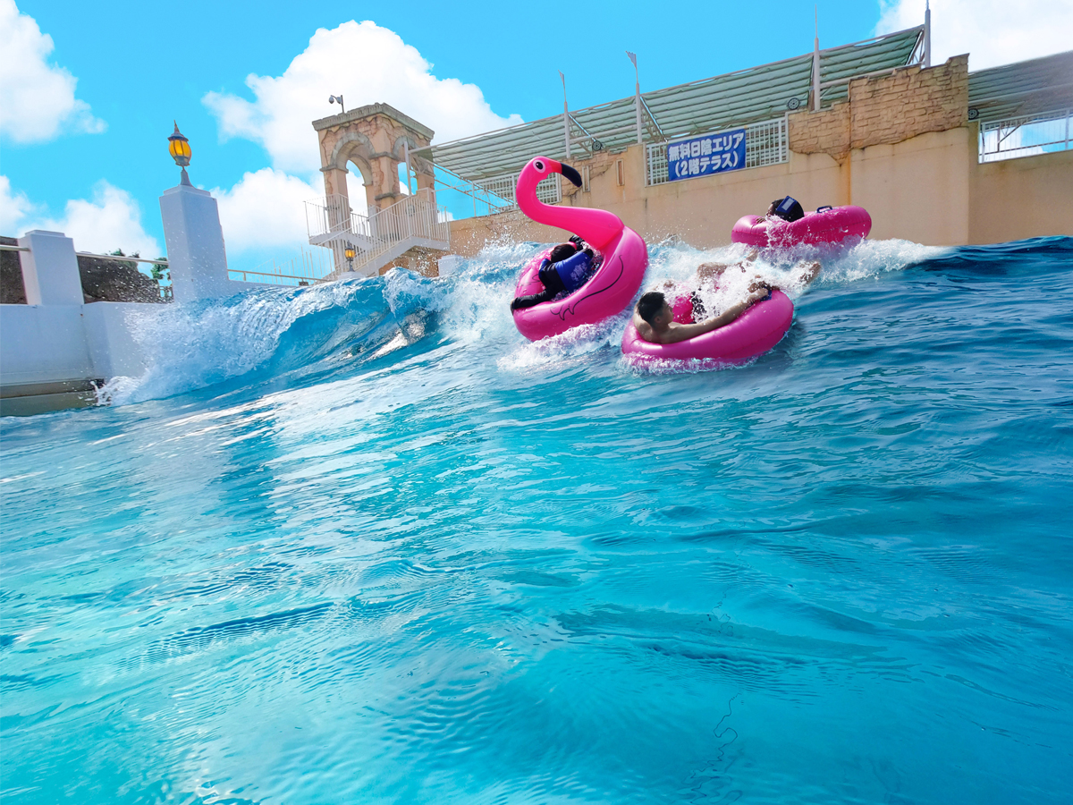 「ジョイアマーレの浜辺」で行われる日本最大級の 1m の大波が発生するイベントです。大波に乗りながら泳ぐスリルが楽しめます。