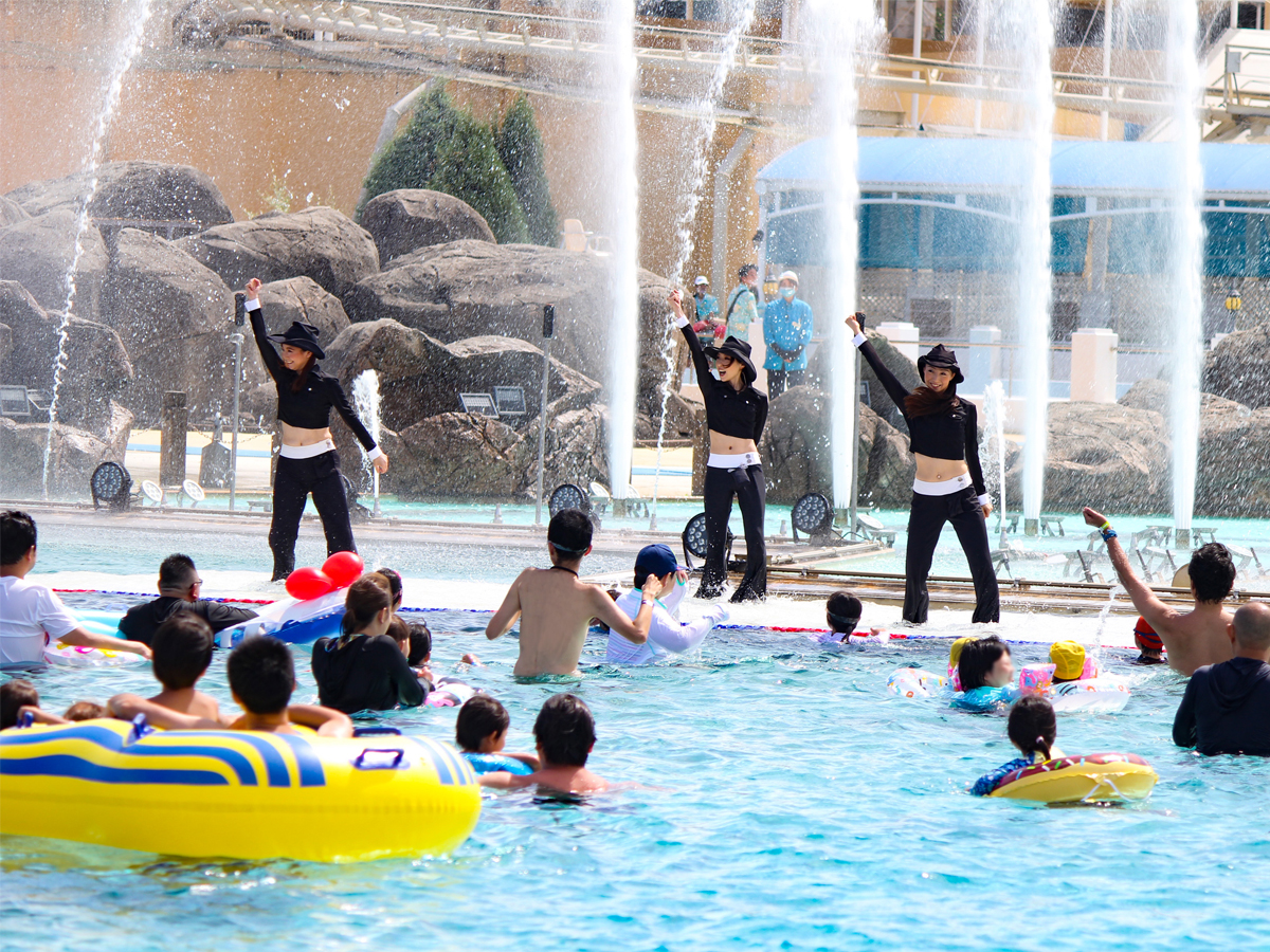 真夏の太陽の下、「ルナポルト」で行われる音楽に合わせて体を動かすプールアクティビティ!噴水の水しぶきを全身に浴びて、爽快感MAXのダンスタイムを楽しもう。