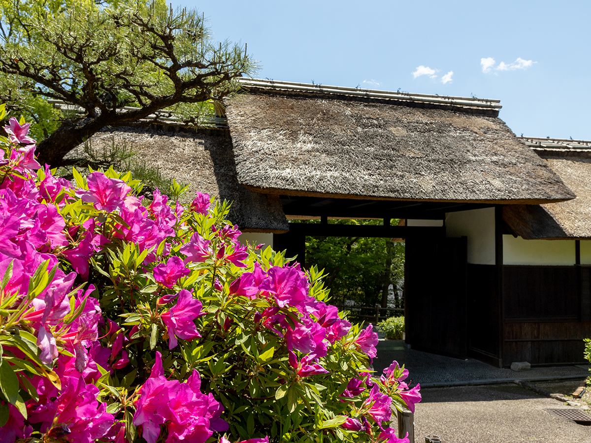 日本陶器(現 株式会社ノリタケカンパニーリミテド)の初代社長である大倉和親氏の別荘として、大正6年頃に築造された邸宅で、昭和2年には賀陽宮恒憲皇(第3師団騎兵第三連隊長)がこの大倉別邸に滞在されたと伝わっています。時代を感じさせる茅葺門をくぐると趣ある庭園が広がり、春はおよそ2,800本のツツジ、初夏はアジサイ、そして秋には紅葉が訪れる人の目を楽しませてくれます。休憩棟と茅葺門は国の登録有形文化財に登録されており、休憩棟には戦時中に作られた防空壕が今もなお残っています。