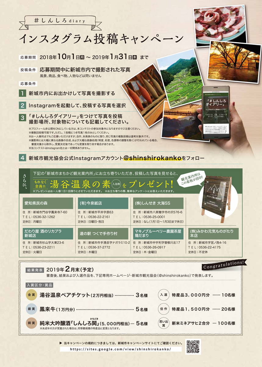 新城市観光協会では、2019年1月31日(木)まで、『「#しんしろダイアリー」インスタグラム投稿キャンペーン』を実施中です。