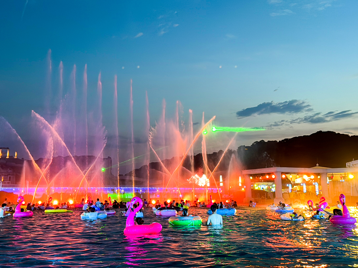 プールに浸かりながら、ダイナミックな噴水ショーを間近で見ることができます。お子さまの入場もOK!家族や友人と一緒に、夜までたっぷり楽しめます。