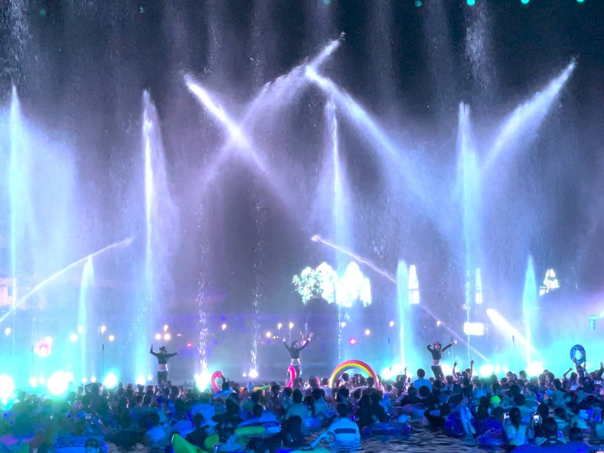 ナイトプール仕様の噴水ショーです。ライトアップされた噴水と音楽、照明が融合し、ナイトプールをさらに盛り上げます。