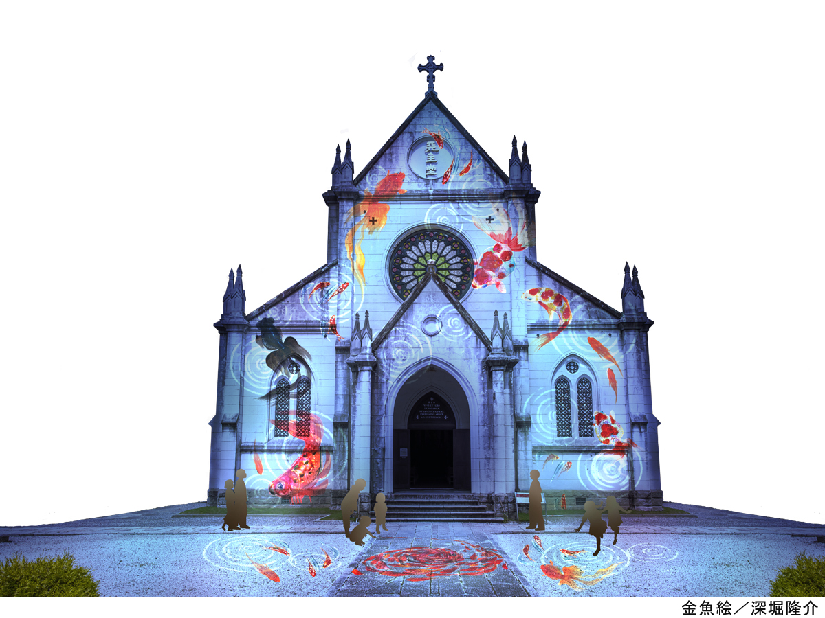 金魚や花火など「夏」をテーマにした映像で教会堂を彩るほか、教会堂前に映し出された金魚などに触れると動き出したり、設置されたオブジェのライティングが変化!