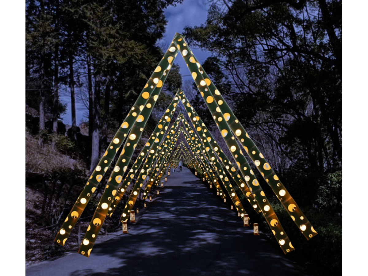 遊歩道に飾られたアーチやオブジェが照らす温かな竹灯りが宵の明治村へ誘います。