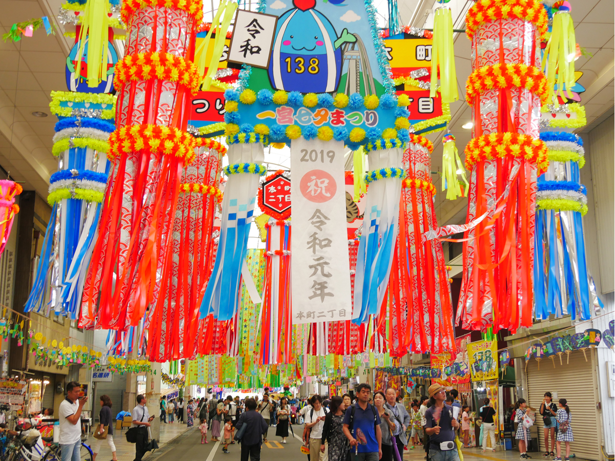 「一宮七夕まつり」は一宮市の最大のイベント。カラフルな七夕飾りに彩られた社殿にて服織神社の神に感謝し、一宮市の基幹産業である機織工業の繁栄を願う神事を行います。また夏の厄払いとして火の輪をくぐり井戸に顔を映す「火の輪くぐり」も行われます。色とりどりの七夕飾りと多くの屋台が一帯を埋め尽くす中、約130万人が訪れます。