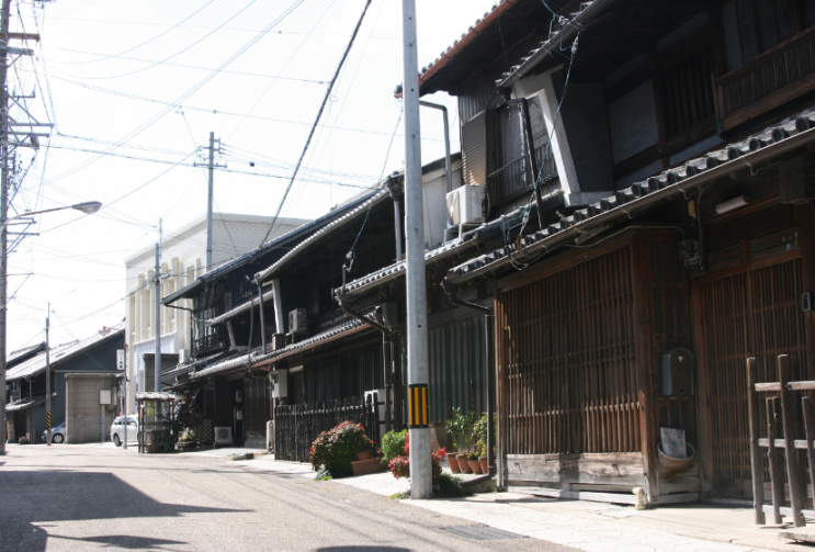 名鉄津島駅から津島神社へと東西に延びる天王通り。この通りに交わる、旧街道の面影を持った道が本町筋。鎌倉時代以来の旧津島上街道の一部で、江戸期には津島と名古屋城下を結ぶ道として賑わいました。沿道には、昔ながらの町家が多く、ノスタルジックな雰囲気。道自体が緩やかにカーブしているのは、かつてこの道が天王川の堤防に沿っていたからだと言われています。