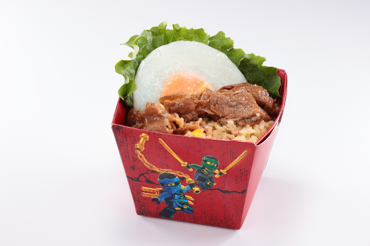 「ニンジャゴー」のフードパッケージに⼊った焼きそばやチャーハン、そしてニンジャゴーの型のカステラなどとにかく「ニンジャゴー」満載のフードが味わえます。
