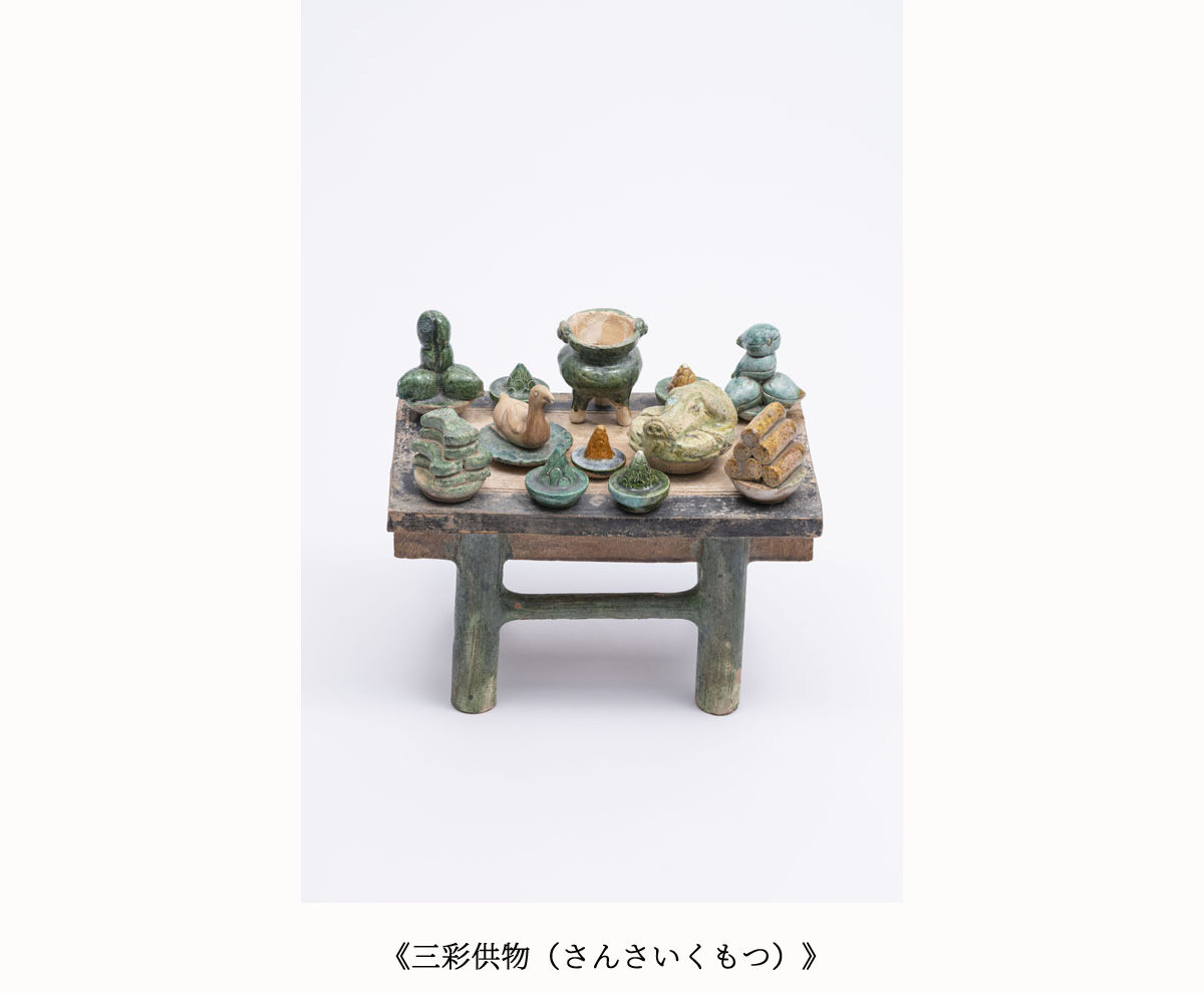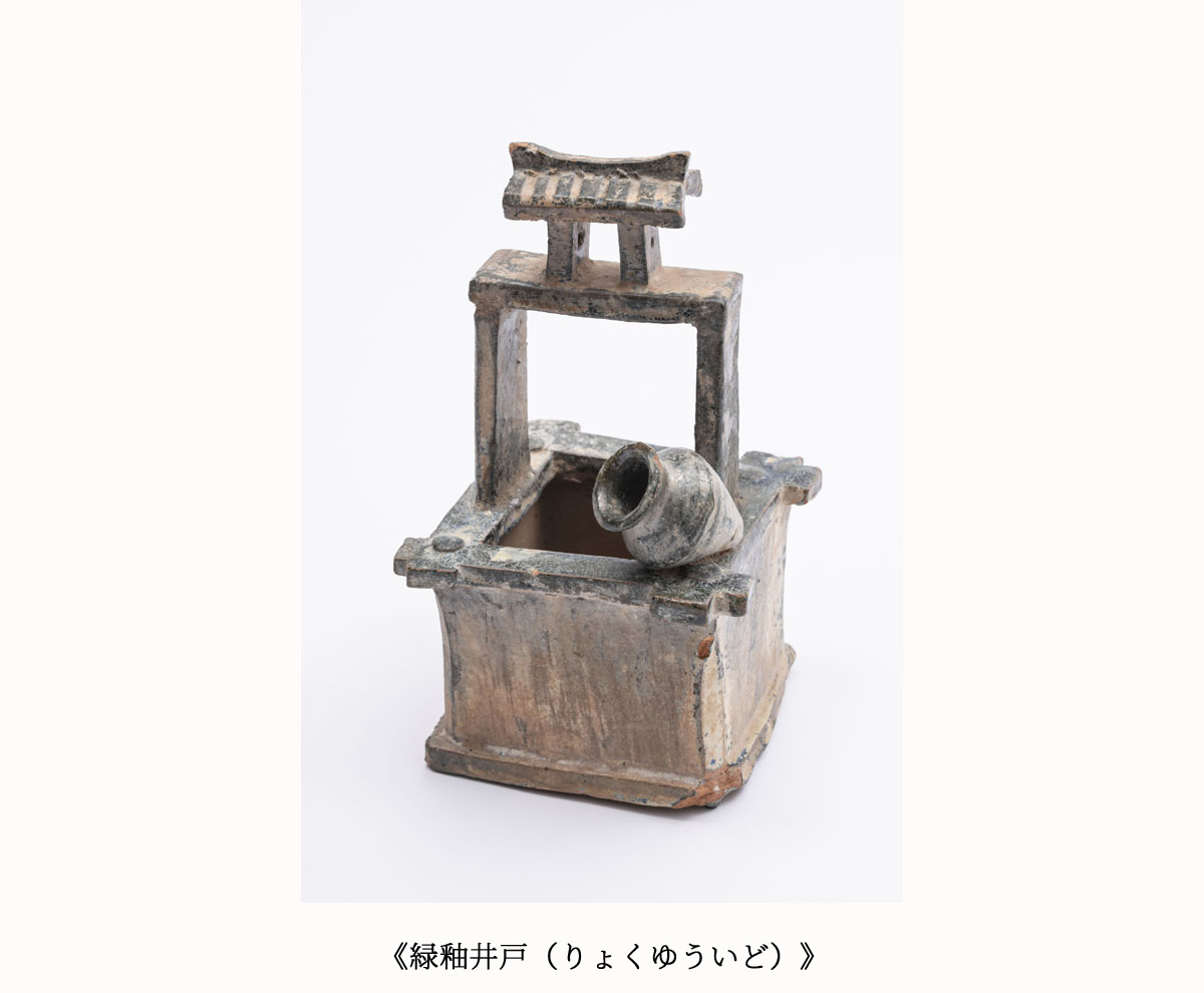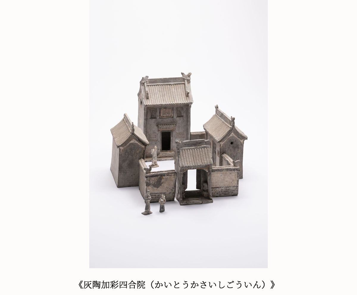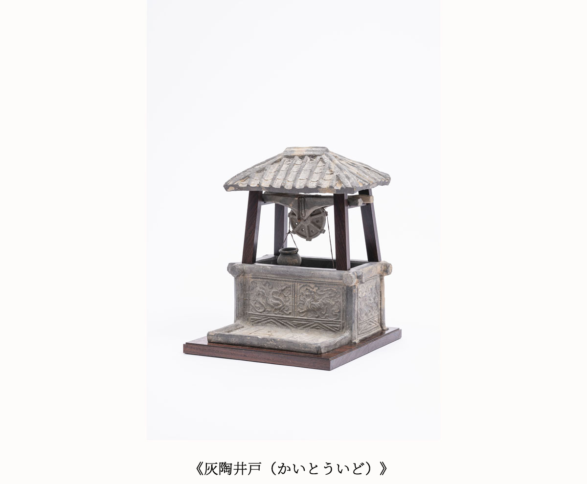 中国古代の墳墓には、家屋、井戸、豚小屋付きのトイレ、カマドや家具など建物や生活用品をかたどった、建築明器と呼ばれる陶製のミニチュア模型が副葬品として埋葬されていました。死者は現世の延長となる世界で生き続けると考えられていたため、来世でも不自由なく幸せに暮らせるようにと、生前の日常にあった、今でいう住宅設備機器や生活様式などがやきもので再現されたのです。大きさも素材も実際とは異なり実用性は失われていますが、理想の暮らしを祈る思いが表出し、素朴ながらも写実的で生き生きとしています。