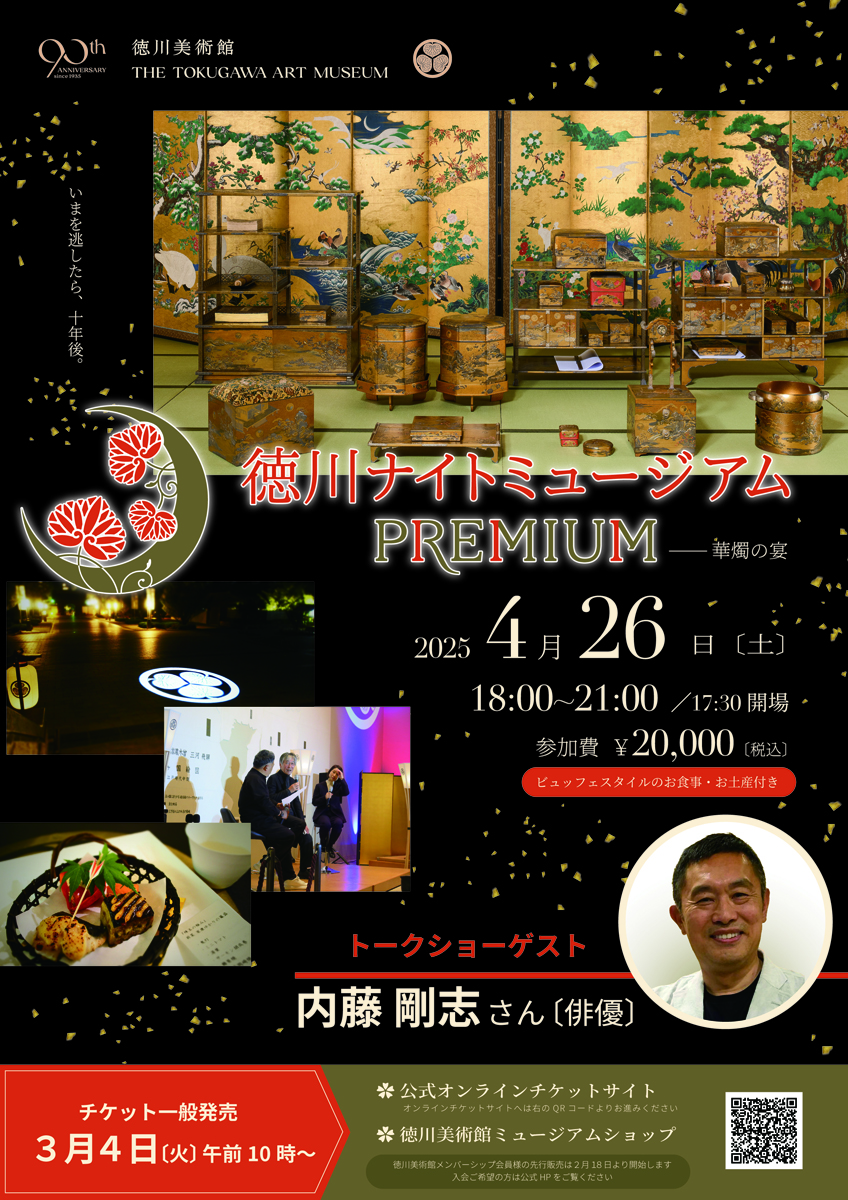 「徳川ナイトミュージアムPREMIUM」は、夜の美術館でお食事やお酒とともに極上の日本美術とゲストによるトークショーを楽しむ特別な一夜です。10年振りに一挙公開される国宝「初音の調度」に合わせて開催する今回のゲストは、ドラマやバラエティで大活躍の俳優、内藤剛志さん。徳川美術館の開館90周年にふさわしい、贅沢な夜をお過ごしください。