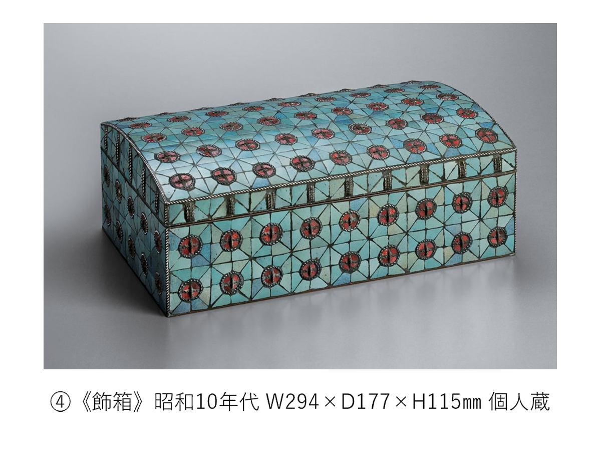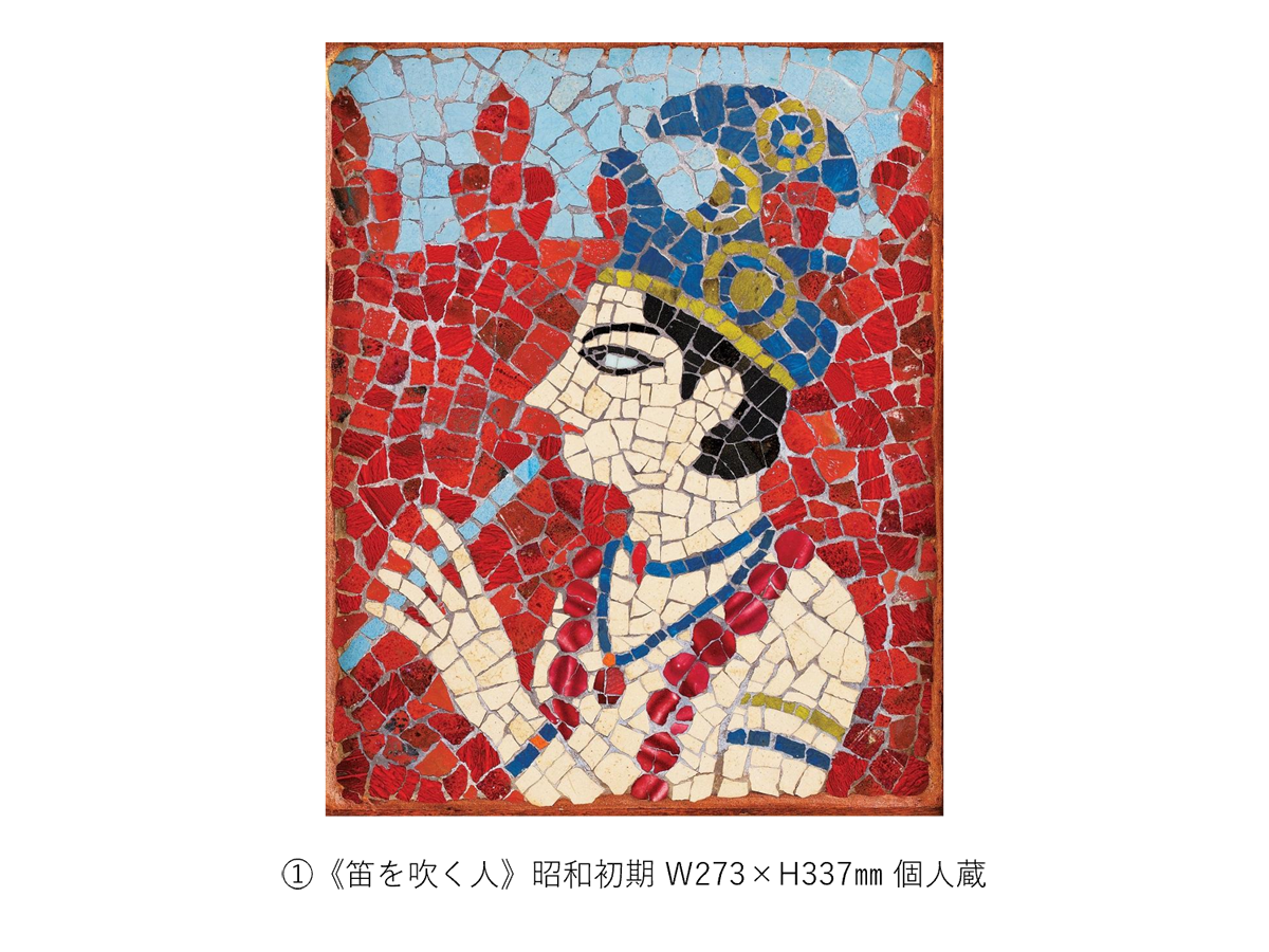 昭和モダンのアートシーンを飾ったモザイク作家・板谷梅樹(いたやうめき/1907‐63)。かつての日本劇場(以下、日劇)のモザイク壁画、瀟洒(しょうしゃ)な飾箱や飾皿、帯留やペンダントヘッドなど、絵画や模様を表出した独特のエキゾチックなモザイク作品は、どれも清新な色彩と可憐な意匠にあふれています。近代陶芸の巨匠・板谷波山(いたやはざん/1872‐1963)の息子であった梅樹は、父が砕いた陶片の美しさに魅了され、20代半ばから陶片を活用したモザイク画の制作を志します。その代表作は日劇一階玄関ホールの壮大なモザイク壁画※でした。現在まで残された作品は多くはありませんが、近年その再評価の機運が高まっています。